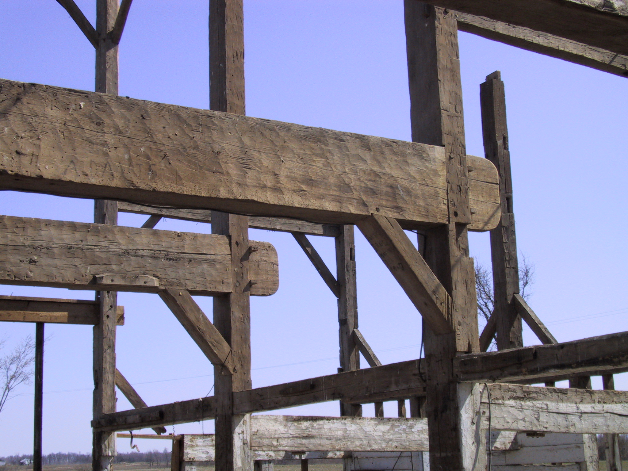 Much had changed in the barn’s 200-year history. Entrances had been added, beams had been cut to make way for windows and hay tracks, others had been undermined by moisture and rot and would have to be replaced. Mysteriously, the sidewalls had been raised several feet and the rafters shortened, reducing the pitch of the roof. (There are many theories about why this was done–it would have been an enormous undertaking–but the most plausible is that long ago the barn was hit by a violent storm, a storm so violent the roof was blown off and the rafters shattered where they met at the peak. In order to salvage them they would have had to been shortened and the sidewalls raised, which would have had a flattening effect on the roof line.) So one of the most difficult and time consuming parts of the renovation was lowering the sidewalls and restoring the rafters to their original length. It was worth the trouble though for we knew that when re-errected, the barn would have the same dramatic roof pitch it would have had when it first went up in 1799. (Note: the exact age of the barn was determined through a process known as dendrochronology.)